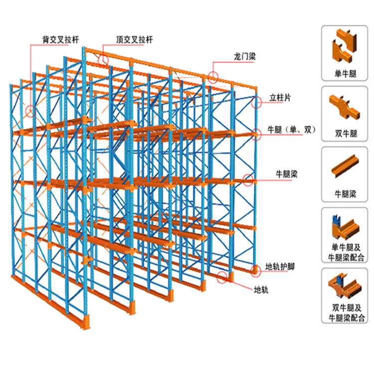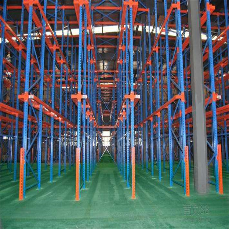 4贯通式货架全插接组装式结构,柱片为装配式结构,靠墙区域的货架总深度一般最好控制在5个托盘深度以内,中间区域可两边进出的货架总深度一般最好控制在10个托盘深度以内,以提高叉车存取的效率和可靠性。
